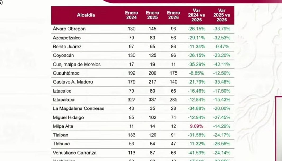 En la comparativa entre los meses de enero de 2024 y 2026, la alcaldía pasó de 79 a 56 delitos de alto impacto, consolidando a Azcapotzalco dentro de las alcaldías con mejores resultados en materia de seguridad en la capital del país con la estrategia articulada a través de la Dirección Ejecutiva de Seguridad Ciudadana y el Centro Azcapotzalco de Respuesta a Emergencias.