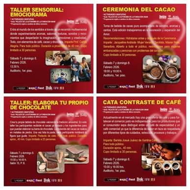 13:30 H. Taller Sensorial: Emociorama, para despertar tus sentidos con elementos de café, cacao y chocolate, con el profesor Carlos Alegría (Auditorio, 1er. Piso)
